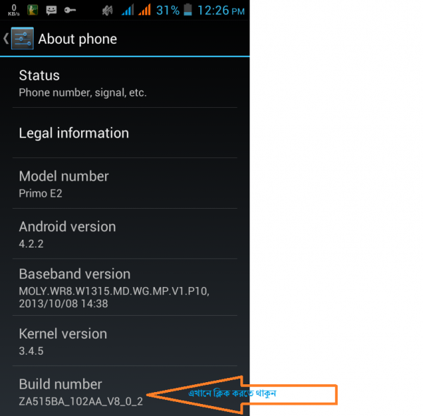 প্রথমে সেটিং এ যান এবার About এ যান এরপর Build Number এ কয়েকবার ক্লিক করুন দেখুন আপনার developer options চালু গেছে।