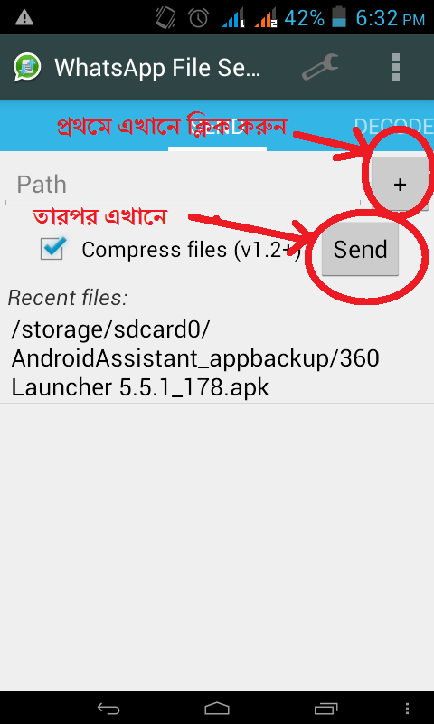 Send করার জন্নে “...” এর উপর ক্লিক করে যেইটা সেন্ড করতে চান সেইটা দেখাই দিন এইবার সেন্ড এ ক্লিক করুন, ফাইল কম্প্রেস হউয়া শুরু হবে। এর পর কম্প্রেস হয়ে গেলে Whatsapp লেখা আসবে ওখানে ক্লিক করলে আপনার Whatsapp লিস্ট শো হবে ওখান থেকে আপনি জাকে খুশি সেন্ড করতে পারবেন।