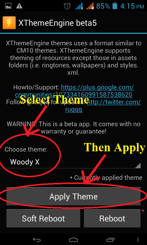 এখান থেকে Xtheme Engine ডাউনলোড করে ইন্সটল করে Gravity Box এর মত এক্টিভেট করুন। এইবার Xtheme Engine ওপেন করলে একটা মেসেজ দেখবেন। মেসেজটা দেখে মনে হবে এত কস্ট করে সব করলাম কিন্তু কিছুই হইলনা। আমিও প্রথমে মেসেজটা দেখে ঘাবড়ে গেছিলাম। তবে, আপনাদের ঘাবড়ানোর কিছু নাই সুধু ব্যাক বাটন এ ক্লিক করুন। দেখবেন মেসেজটি চলে যাবে এইবার আপনি আপনার পসন্দ মত থিম সিলেক্ট করে অ্যাপ্লাই করুন। রিবুট দিন ব্যাস আপনার কাজ শেষ। এখন সুধু আপনার ফোনের নিউ লুক এঞ্জয় করুন।