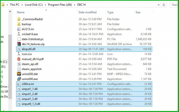 ফোল্ডারটি থেকে সবগুলো ফাইল কপি করে যে গেমটিতে ব্যবহার করতে চান সেটার Installation Directory তে (যেখানে গেম চালু করার মেইন Executable ফাইলটি আছে) পেস্ট করুন। নিচের চিত্রে আমি Don Bradman Cricket 14 এর Installation Directory তে পেস্ট করেছি।
