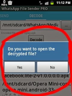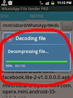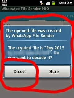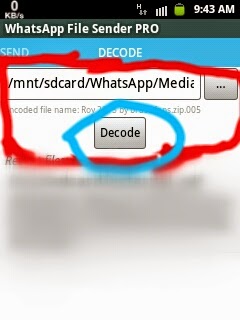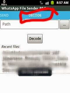 ম্যানুয়ালী ডিকোড:Whatsapp File Sender Pro টি তে ঢুকুন, ডানপাশে থাকা ডিকোড এ যান এবং আপনার কাঙ্খিত ফাইলটি সিলেক্ট করুন নিচের ছবির মত, ঠিক আগের মত (অর্থাৎ সরাসরি ডিকোড ) এর মত সব প্রসেস পাবেন সেগুলো করুন।