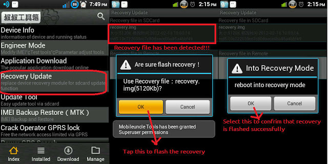 Mobileuncle MTK Tools ওপেন করে নিচের ছবির নির্দেশনা অনুযায়ী কাজ করুন। এরপর ফোন বন্ধ হয়ে আপনাকে রিকোভারী মুডে নিয়ে যাবে। ব্যাস ইনস্টল হয়ে গেল Carliv Touch Recovery