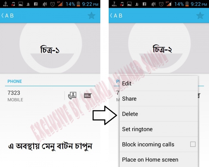 প্রথমে চিত্র ১ এর ন্যয় দেখতে পাবেন এ অবস্থায় ফোনের মেনু বাটনে ক্লিক করলে চিত্র ২ এর ন্যায় অপশন পাবেন। এখন চিত্র ২ এ Block incoming calls এ টিক দিন