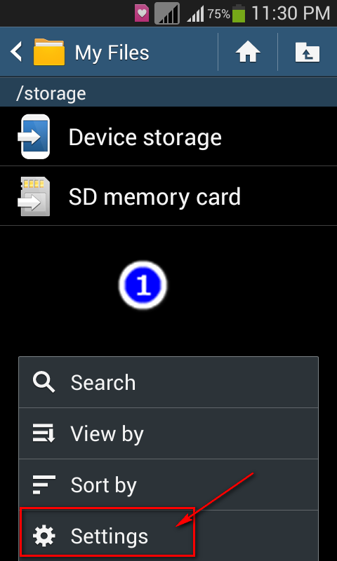 ১/প্রথমে আপনার phone এর default file manager এ যান।এবার সেখান থেকে phone এর left bottom টাতে চাপ দিন।তারপর settings এ যান।নিচের চিত্র গুলো দেখুন...।