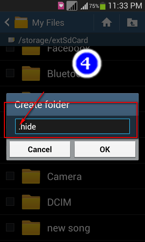 ৪/এবার আমি folder টার নাম দিলাম hide আপনি যেকোনো নাম ব্যাবহার করতে পারেন।শুধু লক্ষ্য রাখবেন যে নামের প্রথমে একটা (.) ডট থাকতে হবে।তারপর ok করুন।