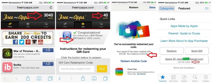 ▓ ▓ নিচে দেয়া ছবিগুলোতে দেখুন, ৩০০০ ক্রেডিটস freemyapps এ জমানোর পর আমি $10 এর আইটিউন্স গিফট Card রিডিম করেছি। সবশেষ ছবিতে দেখুন আইটিউন্স একাউন্টে এখন $10.00 ডলার ক্রেডিট জমা দেখাচ্ছে। 🙂 অ্যান্ড্রয়েড ইউজাররা শুধু আইটিউন্স এর পরিবর্তে গুগল প্লে গিফট কার্ড রিডিম করবেন, বাকি সব মোটামুটি একি!!!