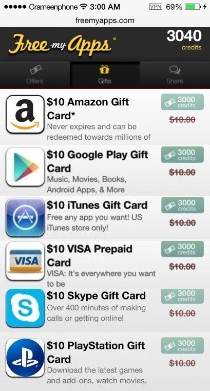 ▓ ▓ উপরের ছবিতে দেখুন freemyapps এর মাধ্যমে 3000 credits জমা হলেই আপনি $10 ডলার মূল্যের গুগল প্লে গিফট কার্ড, আইটিউন্স গিফট কার্ড, অ্যামাজন গিফট কার্ড, ভিসা প্রিপেইড কার্ড, সনি প্লে স্টেশন, স্কাইপ সহ আরও অনেক ধরনের গিফট কার্ড সংগ্রহ করতে পারবেন।