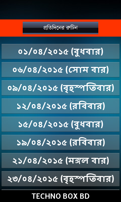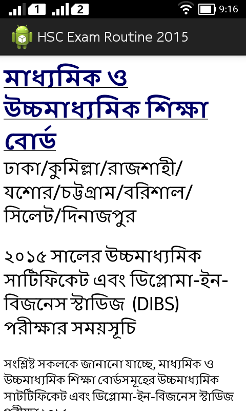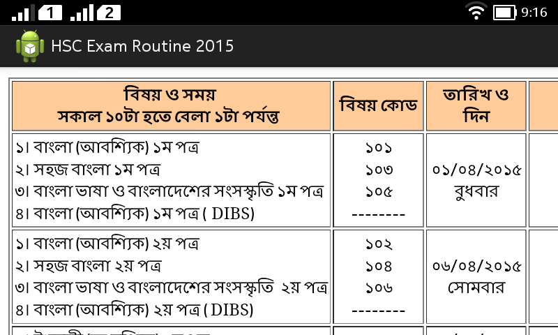 আসসালামু আলাইকুম, আশা করি সবাই ভালো আছেন আজ এইচ. এস. সি পরীক্ষার্দের জন্য নিয়ে আসলাম “HSC Exam Routine 2015 BD V2.0” নামক এন্ড্রয়েড অ্যাপসটি। অনেকেই হয়তো বিভিন্ন ওয়েব সাইট থেকে রুটিন টি পেয়েছেন। কিন্তু বেশীর ভাগ রুটিন এই দেখা যায় যে যার যার ওয়েব সাইট এর নাম এর লেবেল এর ফলে এবং ঝাপসা স্ক্রনিং এর কারনে স্পষ্ট না, তাই এর মাধ্যমে আপনার মোবাইলে ঝক ঝকে রুটিন দেখতে পাবেন।