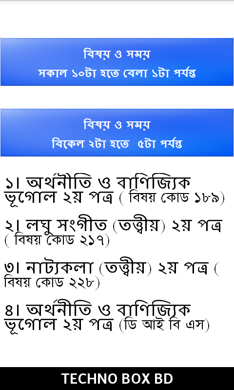 এটা একটা সম্ভাব্য রুটিন অফিসিয়াল নয় যা সকল বোর্ড এ পাঠানো হয়েছে , বোর্ডর অনুমতি স্বাপেক্ষে চুড়ান্ত অফিসিয়াল রুটিন ১২ ফেব্রুয়ারী প্রকাশ করা হবে। যদি এই রুটিন পরিবর্তন হয় তাহলে অ্যাপসটি ও অটোমেটিক আপডেট করা হবে। আশা করি শিক্ষার্ী দের উপকারে আসবে।