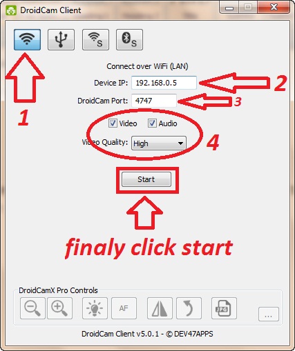 Step 2:আপনার পিসিতে DroidCam.Client.5.0.1 software টা install করে ওপেন করেন।(size 851 kb) official download site http://www.dev47apps.com/ (available for windows and linux os,sorry not available mac os)…আপনাদের কল্যাণে আমি এটাও মিডিয়া আগুনে আপলোড করে দিসি। download link