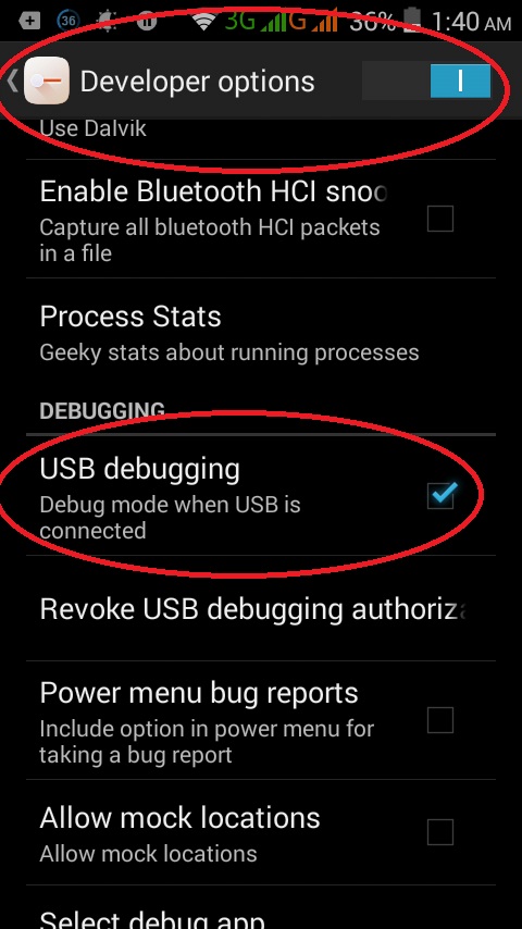 Step 4: প্রথমে আপনার মোবাইলের developer option টা অন করুন।(menu-setting-developer option) তারপর usb debugging এ মার্ক করে দিন।