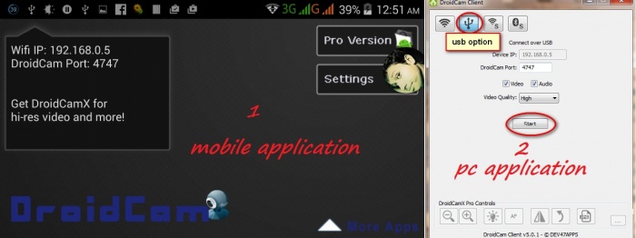 step 5:এবার আপনার মোবাইলে ইন্সটল করা wirless webcam application টা ওপেন করেন তারপর usb দিয়ে পিসির সাথে কানেক্ট করেন,কানেক্ট করার পর আপনার পিসিতে ইন্সটল করা droidcam wirless webcam softwsre ওপেন করে দ্বিতিয় option usb তে গিয়ে স্টার্ট এ ক্লিক করেন।(মোবাইলের এপ্স টা সব সময় ওপেন থাকতে হবে webcam ব্যাবহার করার সময় না হলে কানেক্ট হবে না)
