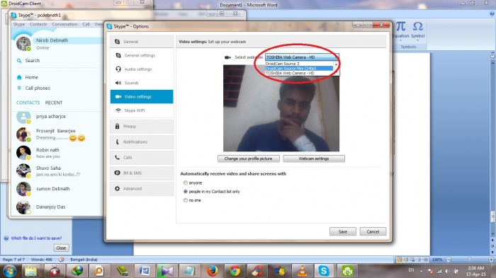 প্রথমে স্কাইপিতে সাইন ইন করা না থাকলে সাইনইন করে নিন তারপর tools-option-video settings এর select webcam থেকে droidcam source 3 অথবা droidcam source mini 240 pixel যে কোন একটা সিলেক্ট করলেই হবে।আমি Toshiba leptop use করি তাই আপনারা এখানে আরেকটা option (Toshiba webcamera hd ) টা দেখেছেন।