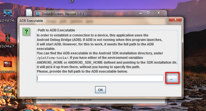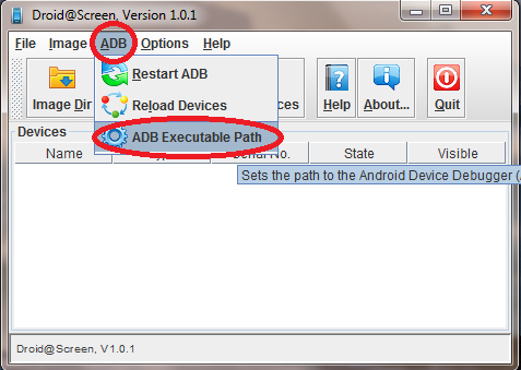 ধাপ ৩-প্রথমে droidATscreen টাকে রান করান। তারপর menu bar থেকে ADB তে ক্লিক করেন,এখন আপনি ৩ টি অপসান পাবেন এখানে আপনি একদম সেস অপসান ADB executable path এ ক্লিক করেন।