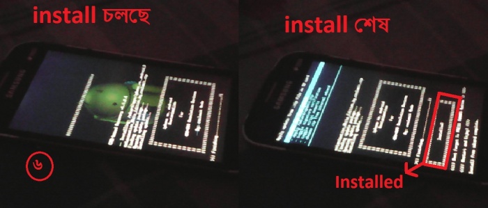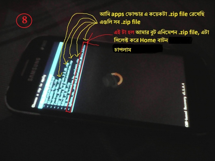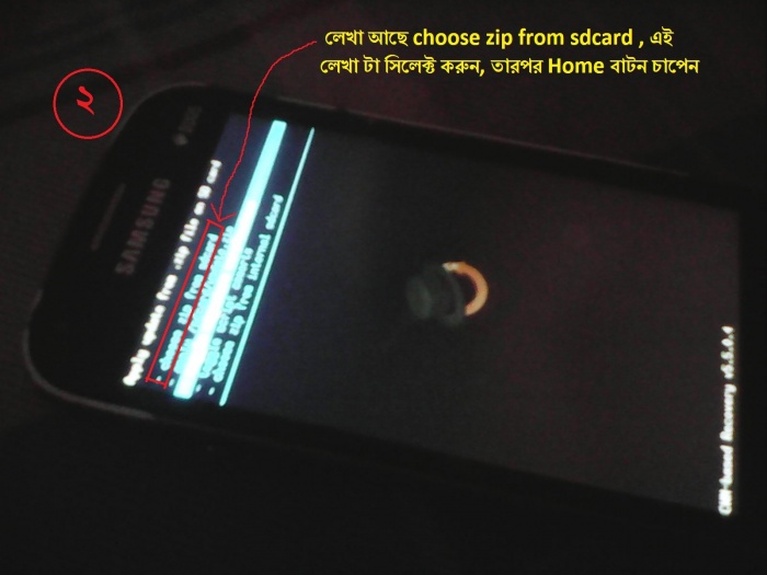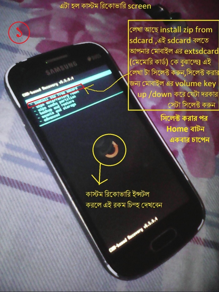 এখন আপনাকে মোবাইল এর রিকভারি মোড এ যেতে হবে ।আপনার মোবাইল টা অফ করে ফেলেন,তারপর মোবাইল এর Volume up & down +power button + Home button (স্যামসাং গ্যালাক্সি এস ডুওস GT-S7562সেটের জন্য)একসাথে চেপে ধরে রাখুন, মোবাইল ভাইব্রেট করলে ছেরে দিন।এখন যে স্ক্রীন আসবে সেটা হল কাস্টম রিকোভারি, এখন নিচের ছবি ফলো করুন-