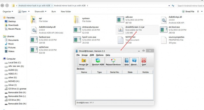 ♦এবার সফটওয়্যারটি ডাউনলোড হলে এক্সট্রাক্ট করুন। আমি Desktop এ করেছি। droidAtScreen-1.1.jar নামের ফাইলটিতে ডাবল ক্লিক করলে এরকম আসবেঃ