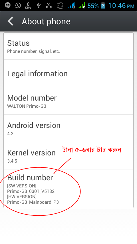 ♦এবারে আপনাকে আপনার সেটের Developer Access টি চালু করতে হবে। এজন্য about phone এ গিয়ে Build Number option টি তে ৫-৬বার পর পর টাচ করুন! দেখবেন আপনার Developer Access টি চালু হয়ে গেছে।নিচের স্ক্রিনশটটি খেয়াল করুনঃ