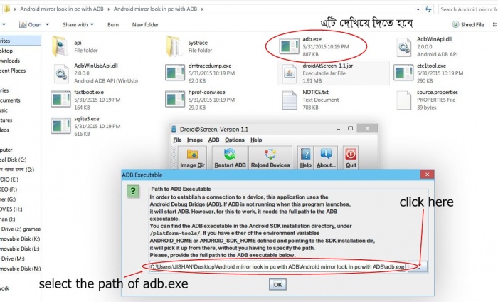 ♦এরপর প্রথমে ADB তে ক্লিক করুন এবং পরে ADB Excutable Path এ ক্লিক করে adb.exe ফাইলটির লোকেশন সিলেক্ট করে ওকে করুন।বিষয়টি সহজ ভাবে বুঝতে নিচের স্ক্রিনশট ২টি দেখুনঃ