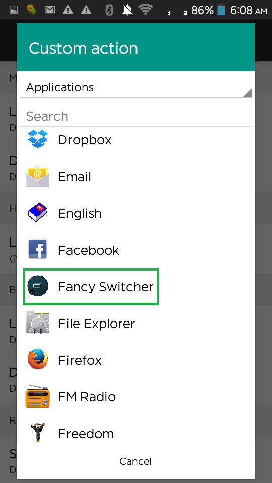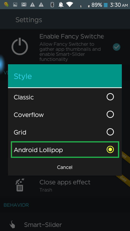 Fancy Switcher সিলেক্ট করুন। এবার আপনি আপনার Home button বা Recent button প্রেস করলে আপনার জেলিবিন বা কিটক্যাটের নয় ললিপপ এর Recent menu বা Multi Tasking Menu ওপেন হবে।