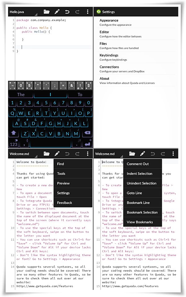 Quoda হলো অ্যান্ড্রোয়েড এর জন্য সবচেয়ে ভালো কোড এডিটর। এটা খুবই শক্তিশালী কোড এডিটর এবং এতে সোর্সকোড এডিটিং এর প্রায় প্রত্যেকটি ফিচার রয়েছে। কম্পিউটার প্রোগ্রামার, ওয়েব ডিজাইনার, ডেভেলপার প্রত্যেকের জন্যই এটি একটি গুরুত্বপূর্ণ অ্যাপ্লিকেশন। কারন এতে যেমন রয়েছে ওয়েব বেইসড প্রোগ্রামিং ল্যাংগুয়েজগুলো ব্যবহারের সুযোগ তেমনি রয়েছে কম্পিউটার প্রোগ্রামিং ল্যাংগুয়েজগুলো লিখা কিংবা এডিটিং এর সহজ পন্থা। তাহলে চলুন একজন প্রোগ্রামারের জন্য অ্যাপ্লিকেশনটি কী কী সুবিধা দিবে একটু জেনে নেওয়া যাক।