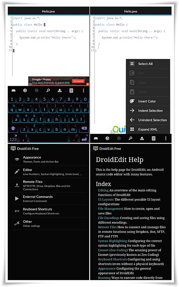 DroidEdit হলো সবচেয়ে পরিচ্ছন্ন, সহজ এবং অসাধারন ইউজার ইন্টারফেইস সমৃদ্ধ কোড এডিটর। এটি কম্পিউটারের বহুল ব্যবহৃত Notepad++ কোড এডিটরের মতো সুবিধা সম্পন্য। Notepad++ এর অ্যান্ড্রোয়েড ভার্সনও বলতে পারেন। এটি মাল্টি-ল্যাংগুয়েজ সাপোর্টেড কোড এডিটর। কম্পিউটারের বেসিক কোড এডিটরগুলোর মতোই আপনি এটাতেও প্রায় ২০০টির অধিক ল্যাংগুয়েজ এর জন্য সিনটেক্স হাইলাইটিং সুবিধা পাবেন। FTP ব্যবহার করতে পারবেন সেটা আগেই বলেছি। তবুও বিশেষ ফিচারগুলো জেনে নিতে পারেন নিচে থেকে।