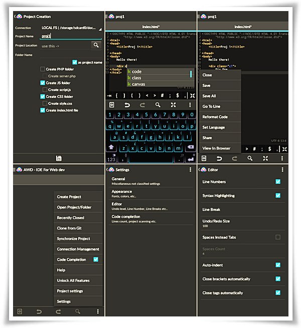 AWD মানে হলো অ্যান্ড্রোয়েড ওয়েব ডেভেলপার (Android Web Developer)। এটা মুলত ওয়েব ডেভেলপমেন্টের জন্য তৈরী করা হয়েছে। এতে রয়েছে ওয়েব ডেভেলপমেন্টের জন্য যাবতীয় গুরুত্বপূর্ণ ফিচার। এর সাহায্যে HTML, CSS, JavaScript এবং PHP কোড লিখতে এবং এডিট করতে পারবেন। এতে রয়েছে ফুল স্ক্রিন ইন্টারফেইস যা আপনাকে কোডিংয়ে অনেক সুবিধা দিবে। এতে বেসিক এবং এডভান্স কোড এডিটর ফিচার সংযুক্ত আছে বিশেষ করে এরর চেকিং। এছাড়া এটি উপরোক্ত এডিটরগুলো মতোই সবগুলো সুবিধা দিতে পারে। তাছাড়া এই এডিটর দিয়েই ওয়েব সাইটের প্রিভিউ দেখতে পারবেন। ভাবতে পারছেন কত্তো মজার জিনিস!
