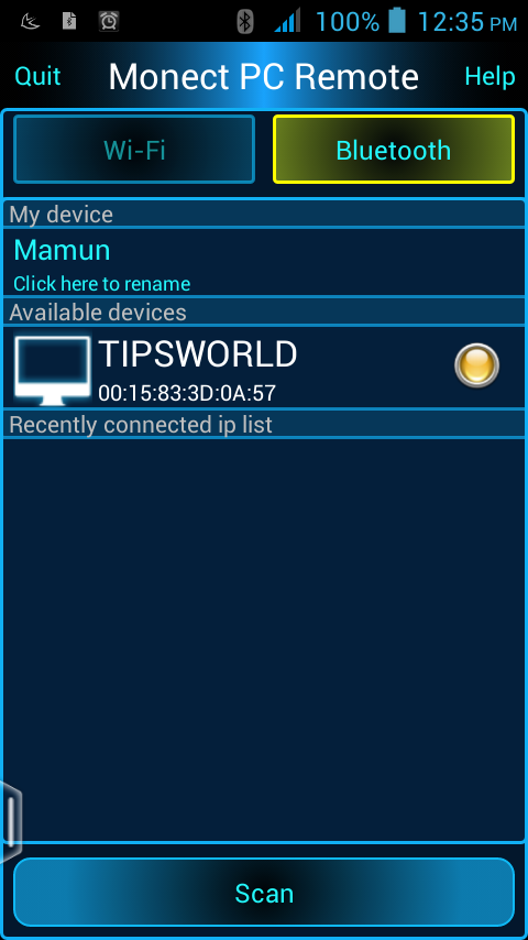 পিসি এবং মোবাইল দুইটাতেই সফটওয়্যার ইন্সটল করার পর মোবাইলে অ্যাপটা ওপেন করুন। ব্লুটুথ/ওয়াই-ফাই যেই কানেকশন আপনার আছে সেই ট্যাবে ক্লিক করুন।স্ক্যান করলে আপনার পিসি অটোমেটিক চলে আসবে। পিসি নামের উপর ক্লিক করুন কানেক্ট হয়ে যাবে।