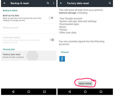 ৫। Factory Data Reset: উপরের ধাপ গুলিতে যদি কাজ না হয় তাহলে আপনি আপনার ফোন্টির Factory Data Reset করতে পারেন। কিন্তু এক্ষেত্রে আপনাকে মনে রাখতে হবে যে Factory Data Reset এর ফলে আপনার ফোনের সকল ডাটা মুছে যাবে যেমনঃ SMS, Contact Number, Call Log. এ ক্ষেত্রে আপনি আপনার ফোনের এ সব তত্ব back up রাখতে পারেন বিভিন্ন পদ্ধতিতে। তো রিসেট দেওয়ার জন্য নিচের ধাপ গুলি অনুসরন করুন