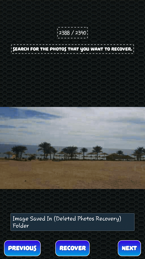 ২. তারপর ডিলিট হয়ে যাওয়া ছবি দেখতে পাবেন। যে ছবিটি ডিলিট হবে সেটি Recover অপশনটিতে ক্লিক করবেন। এবং তা সেভ হবে Deleted Photo Recovery ফোল্ডারে। Next or Previous দিয়ে আগে পিছে যেতে পারবেন।