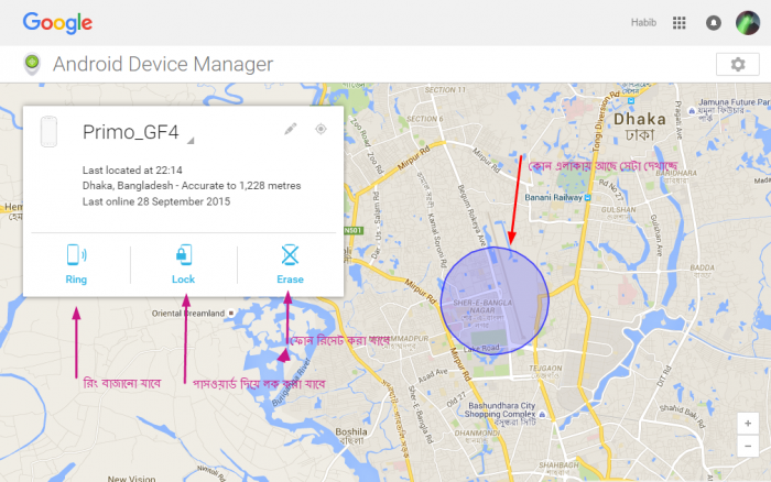 map: কোন এলাকায় ফোনটা আছে দেখা যায়। মোবাইল সব সময় অনলাইনে রাখলে এই সিস্টেমটা কাজে লাগতে পারে।কিন্তু এটার গ্যারান্টি নাই রিসেট ফোন রিসে দিলে সব চলে যায়। একটা স্ক্রিনশট দিলাম।