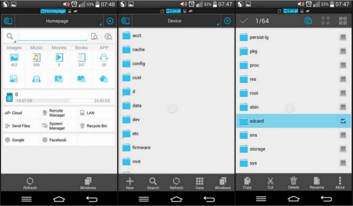File Manager – Manage your files as you would on a desktop or laptop using several options such as Cut / Copy / Paste, Move, Create, Delete, Rename, Search, Share, Send, Hide, Create Shortcut, Bookmark and others.