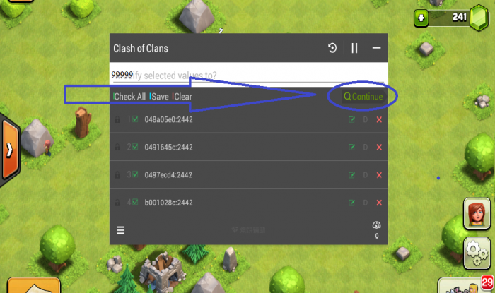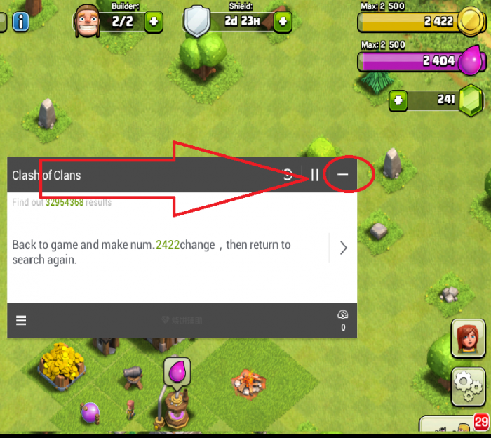 ১০.তারপর Search হয়ে গেলে এই রকম আসবে তারপর Minimize করে আপনি যেটা বারাতে চাচ্ছেন সেটার ভেলু বারাতে হবে। সে ক্ষেত্রে আপনি coins,gems,elixir কালেক্ট করে বারাতে পারেন। যেমন:2422 থাকলে কিছু কালেক্ট করে 2500 করতে পারেন অথবা 2423 হলেও চলবে।আপনার ইচ্ছা মত করতে পারেন তবে যেটা আছে অবশ্যই তার বেশি হতে হবে।কিন্তু কালেক্ট করার পর বর্তমান এ যেই ভেলু আছে সেটা বসাতে হবে।