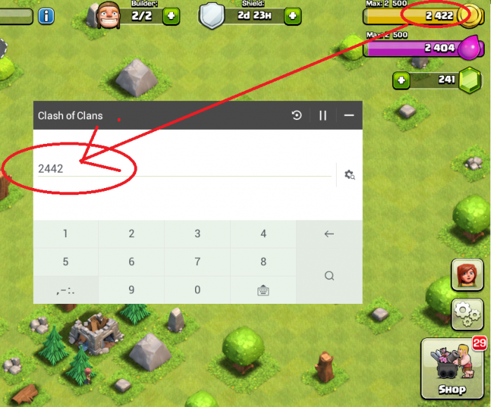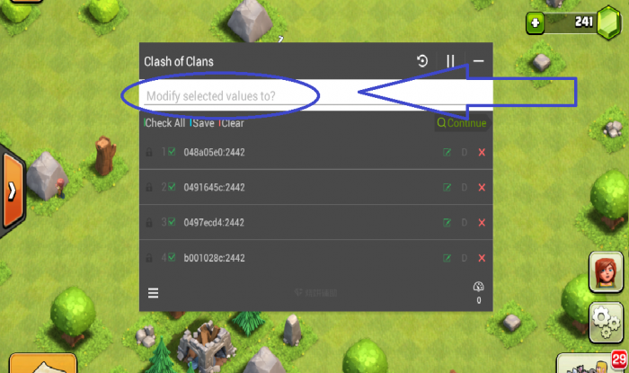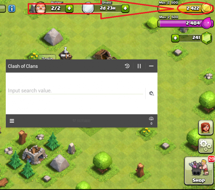 ৭.এবার আপনার গেম এর coins,gems,elixir অনুযায়ী বর্তমানে যত গুলো আছে সেটা লিখুন। যেমন : আমার coin আছে 2422 টি তাই বসাতে হবে 2422।তারপর আবার Minimize করুন এবং ভেলু বারান।