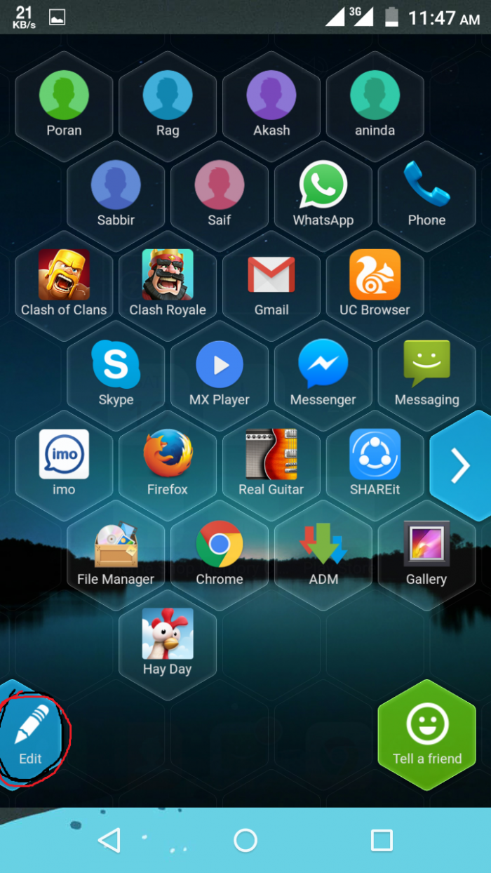 অ্যাপ ২টা ইন্সটল হওয়ার পর Launcher Planet কে ডিফল্ট লাঞ্চার করে দিন তার পর Honeycomb নিজের মত করে সাজিয়ে নিন। যদি কেও সাজাতে না পারেন তাহলে নিচের screenshot এর দিকে তাকান নিচের screenshot এ mark করা অংশ বাম দিকে টানলে Honeycomb এর মেনু পাবেন।