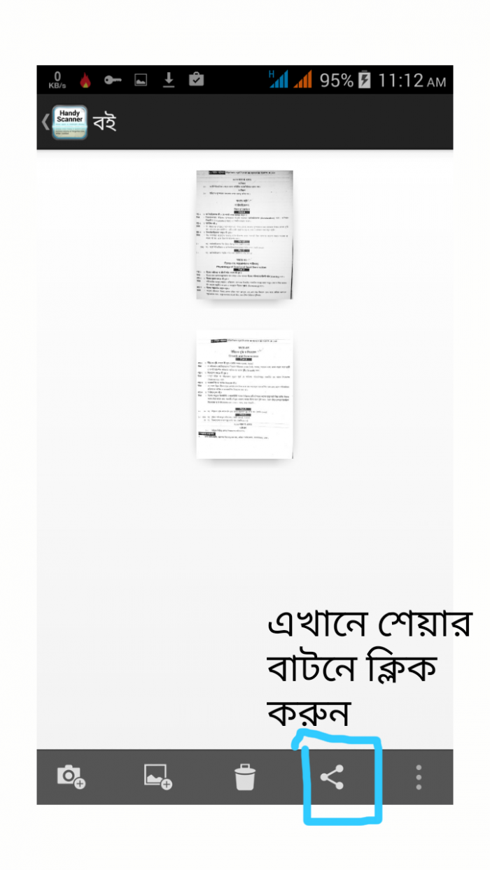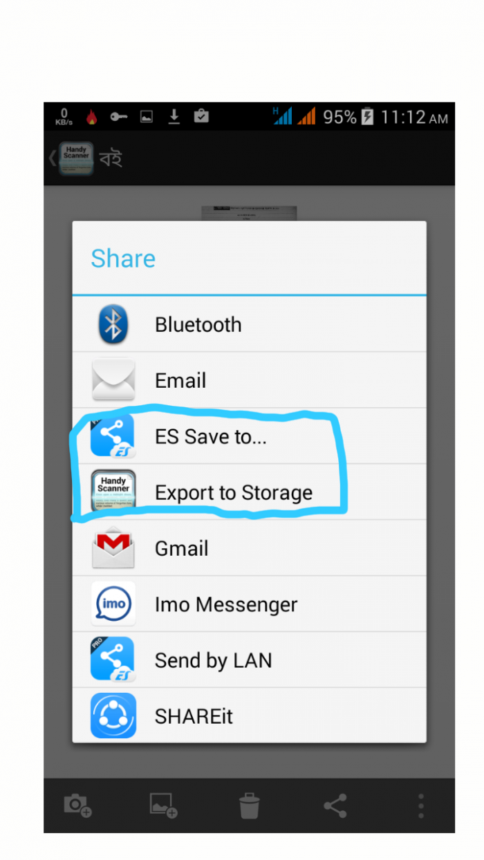 এবারে উপরের ছবিতে চিহ্নিত শেয়ার বাটনে ক্লিক করে নিচের ছবির মত যে কোন একটি মাধ্যম ব্যবহার করে আপনার ডকুমেন্ট আপনার মেমরিকার্ড বা ফোন মেমোরিতে সেভ করে নিন।