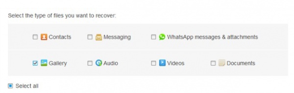 ৪| আপনার মোবাইলটি যদি কানেক্ট হয়ে যায় তাহলে নিচের ক্যাটেগরি গুলো দেখাবে। সেখান থেকে "Gallery'' তে ঠিক চিহ্ন দেন। যেহেতু আমরা শুধু ফটো রিকভার করতে যাচ্ছি, সেহেতু আমরা "Gallery'' তে ঠিক দিলাম।