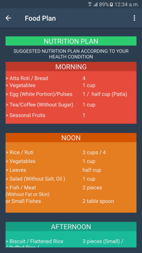 অ্যাপটি প্রথমে ইউজারের কাছ থেকে বয়স, ওজন, উচ্চতা ইত্যাদি তথ্য নিবে। তারপর প্রদান করা তথ্য অনুযায়ী তার বিএমআই (বডি মাস ইনডেক্স) ক্যালকুলেট করে একটি খাবার প্ল্যান তৈরী করবে। বয়স, ওজন ও উচ্চতাভেদে একেকজনের জন্য একেক রকমের খাবার প্ল্যান। এখানে সকালের নাস্তা, দুপুরের খাবার, বিকালের নাস্তা ও রাতের ডিনারে কি কি খাওয়া উচিত তা পরিমানসহ দেখানো হবে।