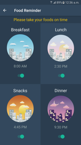 আপনি যেন সঠিক সময়ে খাবার গ্রহন করেন সেজন্য রয়েছে ফুড রিমাইন্ডার। প্রতিবেলা খাবারের আগে আপনি সময় সেট করে রাখতে পারবেন। প্রতিবেলা খাবারের সময় আপনাকে এটি একটি রিমাইন্ডার দিবে।
