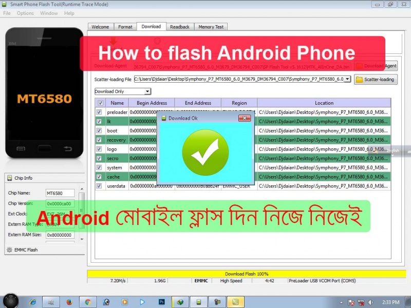 ধাপ ১০ঃ যখন ফ্ল্যাশ সম্পূর্ণ হবে, তখন Download ok (সবুজ বৃত্ত) পপআপ বার্তা পাবেন।