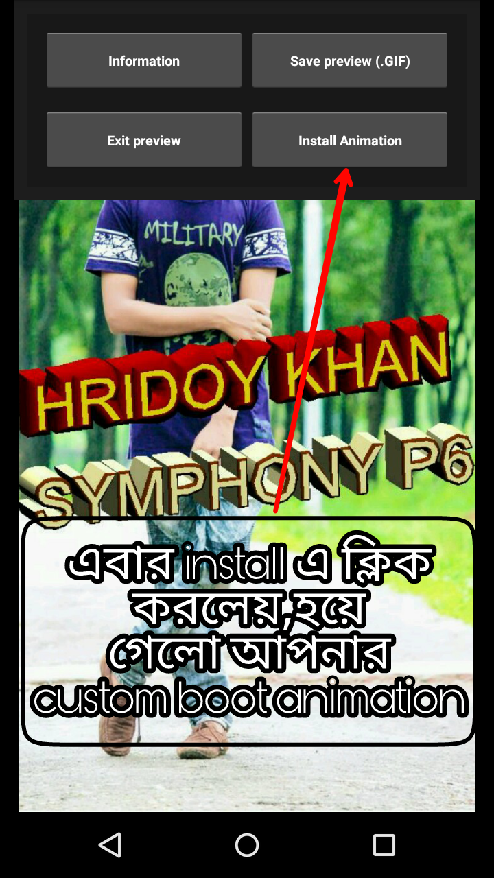 এবার Install animation এ ক্লিক করলে-ই হয়ে গেলো আপনার Custom boot animation. আমার টিউন টি ভাল লাগলে ও এরকম আরো টিপস ও ট্রিক্সস জানতে টেকটিউনসের সাথেই থাকুন। সবাই ভালো থাকবেন, সুস্থ থাকবেন এবং সবসময় Itech banglar সাথে থাকুন, ধন্যবাদ আল্লাহ হাফেজ। আর হ্যাঁ,টিউন টি কেমন লাগলো তা টিউমেন্ট করে জানাতে ভুলবেন না।