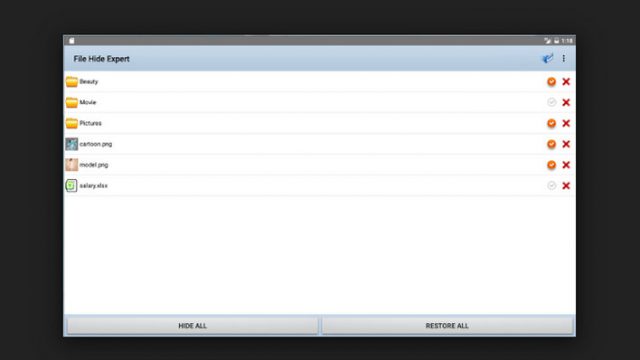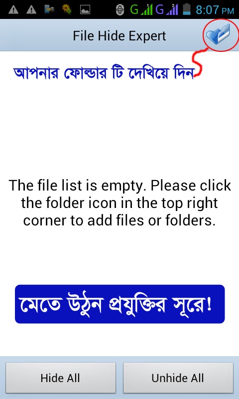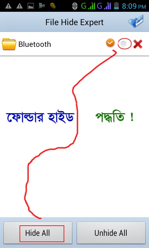 এবার Folder এর পাশে টিক চিহ্ন দিয়ে Hide All বাটনে ক্লিক করুন, তাহলে মেমোরী/ফোন মেমোরী থেকে Folder টি লুকিয়ে যাবে। আবার লুকিয়ে রাখা ফোল্ডার ফিরেয়ে আনতে হলে Unhide All বাটনে ক্লিক করুন।