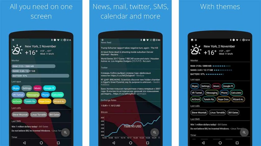 AIO লঞ্চারটি অন্যান্য অ্যানড্রয়েড লঞ্চার অ্যাপ্লিকেশনগুলির ভিন্ন। এটি আপনার সাম্প্রতিক এসএমএস এবং মিসড কল, আপনার মিডিয়া প্লেয়ার, আপনার সিস্টেমের তথ্য (RAM, ব্যাটারি, স্টোরেজ ইত্যাদি) এবং এমনকি সংবাদ, বিটকয়েনের মূল্য, টুইটার ইত্যাদি বিষয়গুলি দেখায়।