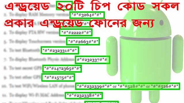 অ্যান্ড্রয়েড ২০টি চিপ কোড, সকল প্রকার অ্যান্ড্রয়েড ফোনের জন্য অতি সহজে সমাধান করুন আপনার সমস্যা। এই ২০ টি গোপন কোড আপনাকে স্মার্টফোন ব্যবহারের চিত্র পরিবর্তন করে দিবে। আপনার অজানা অনেক সহজ সমস্যার সমাধান।