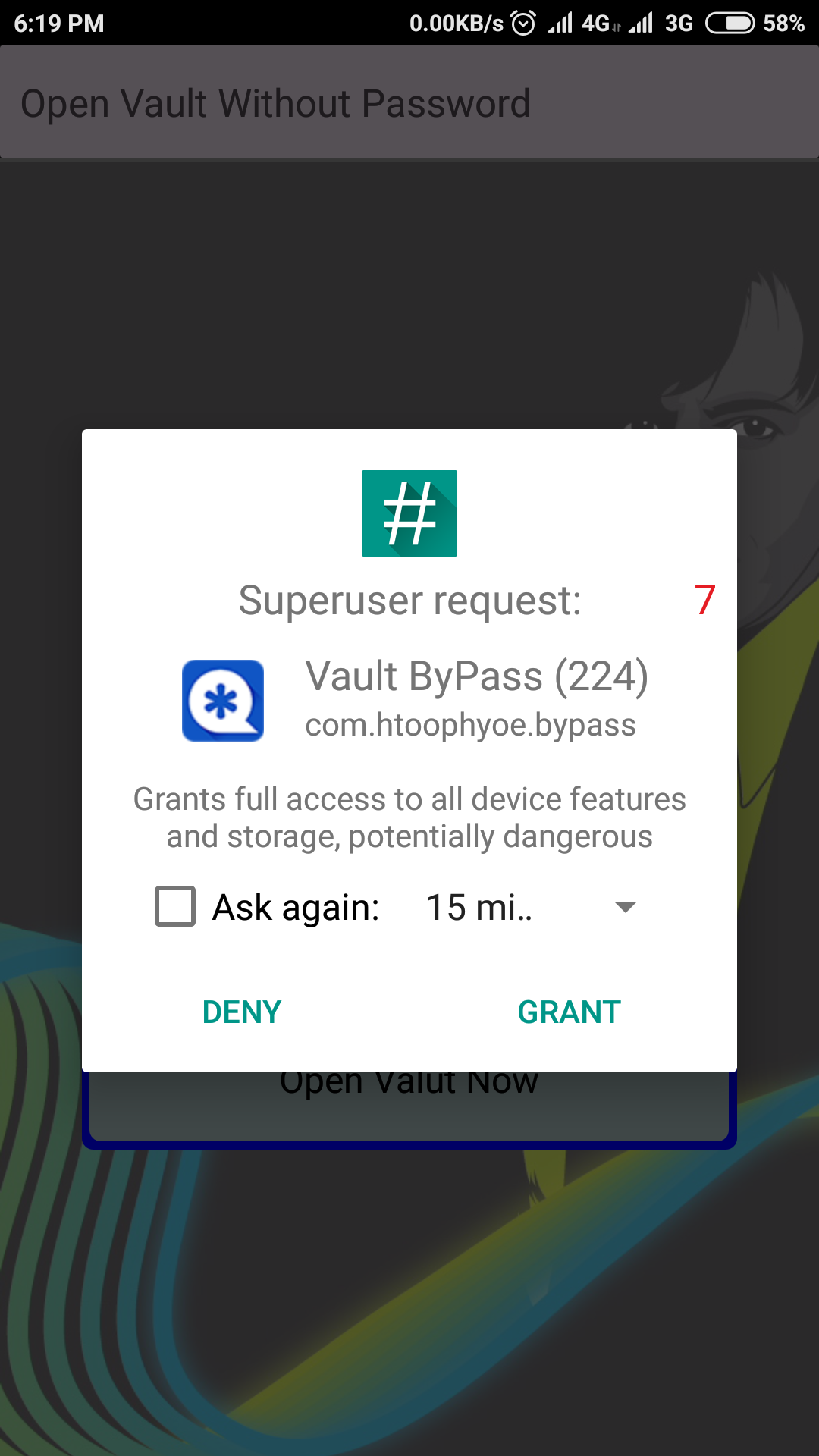 শুধু মাত্র vault bypass সফটওয়্যারটি ওপেন করে রুট পারমিশন চাইলে ok তে ক্লিক করবেন। তারপর open vault now তে ক্লিক করবেন। ব্যাস আপনার vault ওপেন হয়ে যাবে।