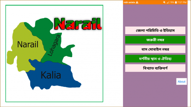 আজ নিয়ে আসলাম আরেকটি টিউন। পথ চলা শুরু হল নড়াইলের প্রথম মোবাইল অ্যাপের। সাধারন সুযোগ সুবিধা আর দরকারি কিছু নম্বর দিয়ে সাজানো হয়েছে অ্যাপসটি। আপনি এখান থেকে হসপিটাল, পুলিশ স্টেশন, ফায়ার সার্ভিস এমনকি বাসও বুকিং দিতে পারবেন। এটা শুধু নড়াইলবাসিদের সুবিধার জন্য করা। দেখে নিন।