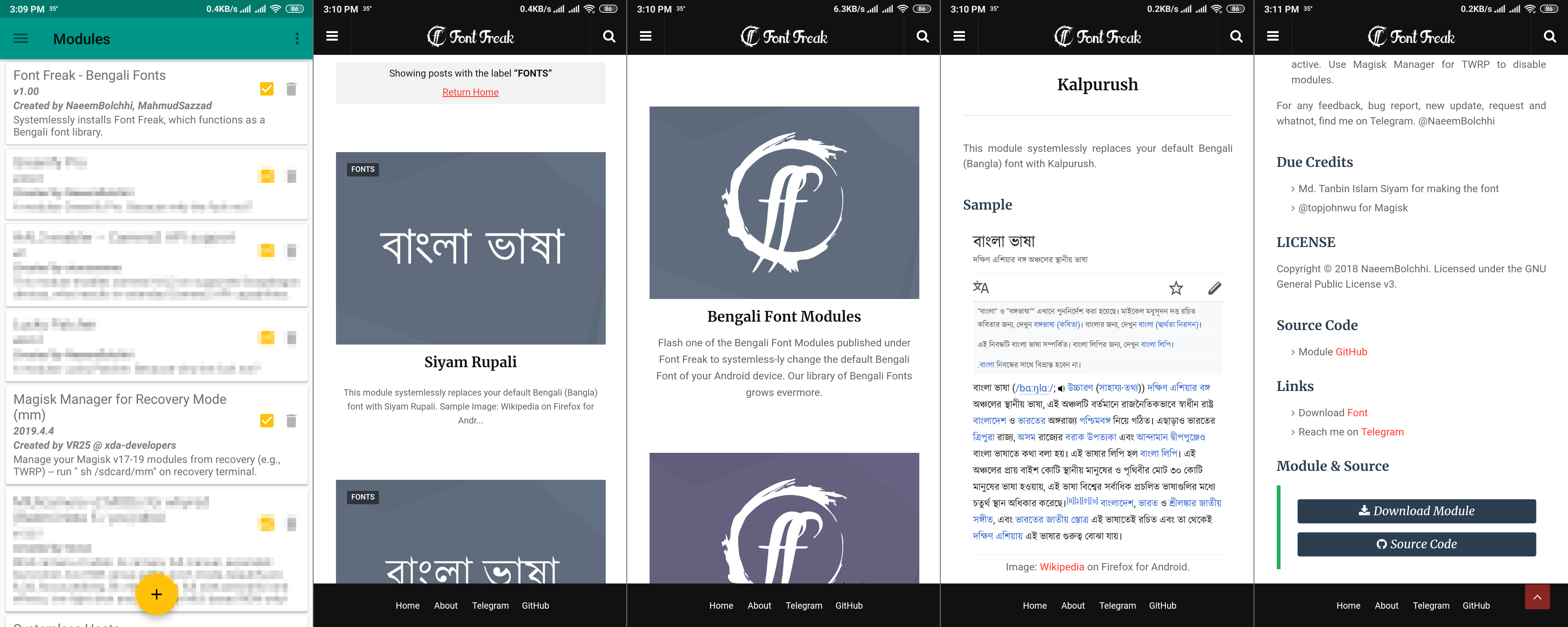 এটি একটি অ্যাপ যা নিজেই একটি মডিউল আকারে পাওয়া যাচ্ছে। অর্থাৎ এটি ইন্সটল করতে হলে আপনাকে মাজিস্কের মাধ্যমে জিপ ফাইল ফ্ল্যাশ করতে হবে। তারপর আপনি "Font Freak" নামে একটি অ্যাপ পাবেন, যেটার মধ্যে আছে অসংখ্য বাংলা ফন্ট মডিউল (এই মুহূর্তে ১০টি, ১৯ মে ২০১৯; এই সংখ্যা আরও বাড়বে)। যেকোনো ধরনের সমস্যার ক্ষেত্রে মডিউল আনইন্সটল করলেই হবে। কোনো রিস্ক নেই!