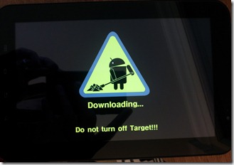 • প্রথমে আপনার ডিভাইসটি ডাউনলোড মোডে চালু করুন। গ্যালাক্সী ট্যাবে এটা করার জন্য পাওয়ার বাটন ও ভলিউম-ডাউন বাটন একসাথে চাপতে হবে। এই অবস্থায় আপনার এনড্রয়েড ডিভাইসটির স্ক্রিণে নীচের মত একটি ছবি আসবে।