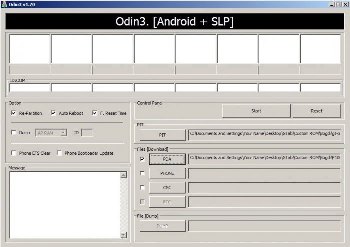• এবার ওডিন প্রোগ্রামের PIT নামের বাটনটিকে ক্লিক করুন ও  আপনার প্রয়োজনীয় ফাইল ফোল্ডার থেকে PIT ফাইলটি দেখিয়ে দিন (স্যামসাং গ্যালাক্সী ট্যাবের জন্য এটি gt-p1000_mr.pit)। খেয়াল করুন অপশন বক্সের তিনটি অপশনই স্বয়ংক্রীয়ভাবে সিলেক্ট হয়ে গেছে।