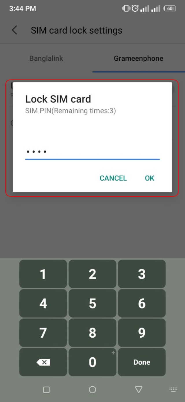 ৪. এখন এখানে সিমটির ডিফল্ট পিন নম্বর দিতে বলবে, যা আপনি সিমটির কাগজে পেয়ে যাবেন। আর, আপনার সিম কার্ডটি কোন অপারেটরের এবং তাদের ডিফল্ট পিন নম্বর কি, এটি জানার জন্য আপনি গুগলে সার্চ করতে পারেন। এই মুহূর্তে আমি গ্রামীণফোনের সিম কার্ড ব্যবহার করছি, তাই আমি গ্রামীণ সিমের ডিফল্ট পিন ১২৩৪ ইনপুট দিয়ে Ok করবো।