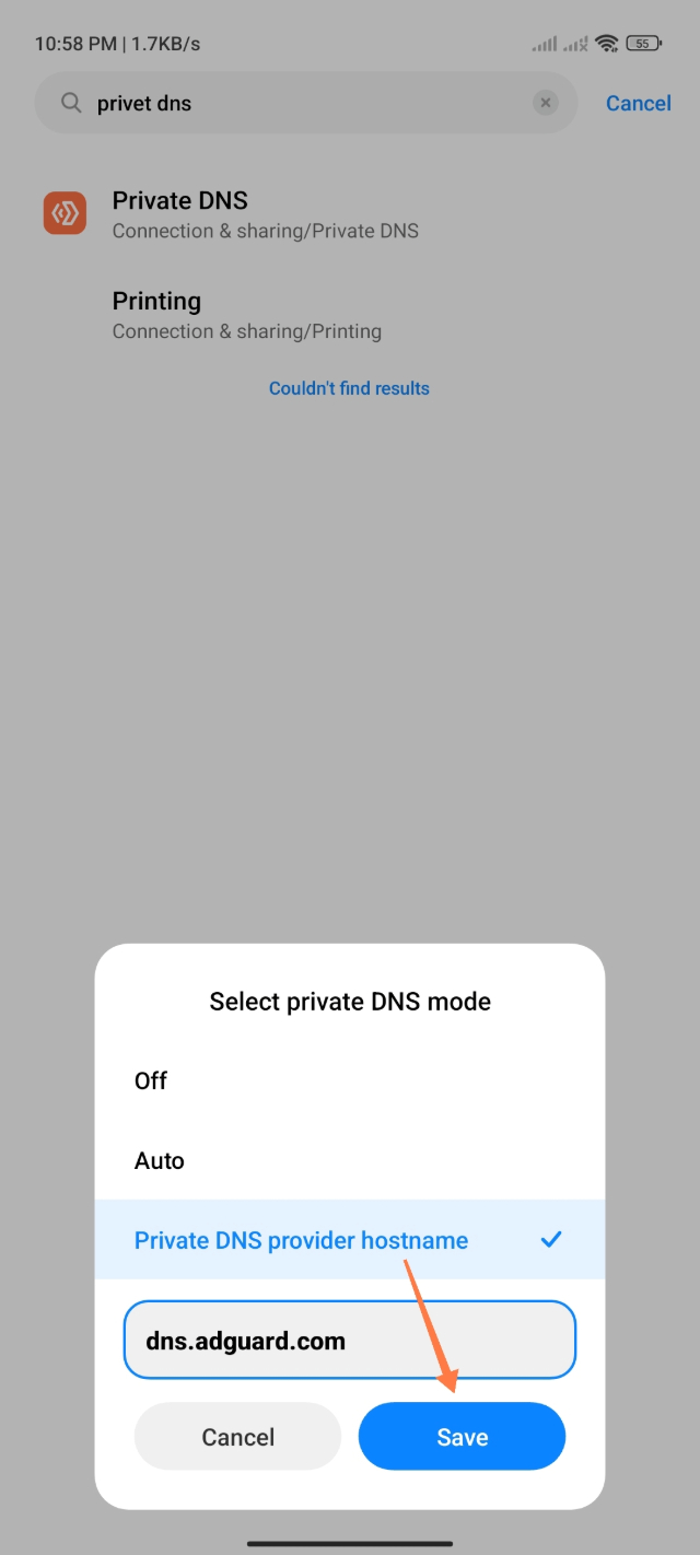 ৫. তারপর এখানে লিখুন dns.adguard.com লেখা হয়ে গেলে নিচে Save অপশনে ক্লিক করে লেখাটি সেভ করে দিন।